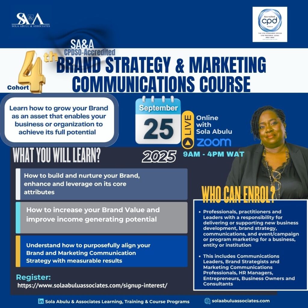 August 30, 2025 -Enrolment is now open for the 4th cohort of the Sola Abulu & Associates (SA&A) CPDSO-Accredited Brand Strategy & Marketing Communications Course scheduled for Thursday September 25, 2025 from 9AM – 4PM West Africa Time online via ZOOM.