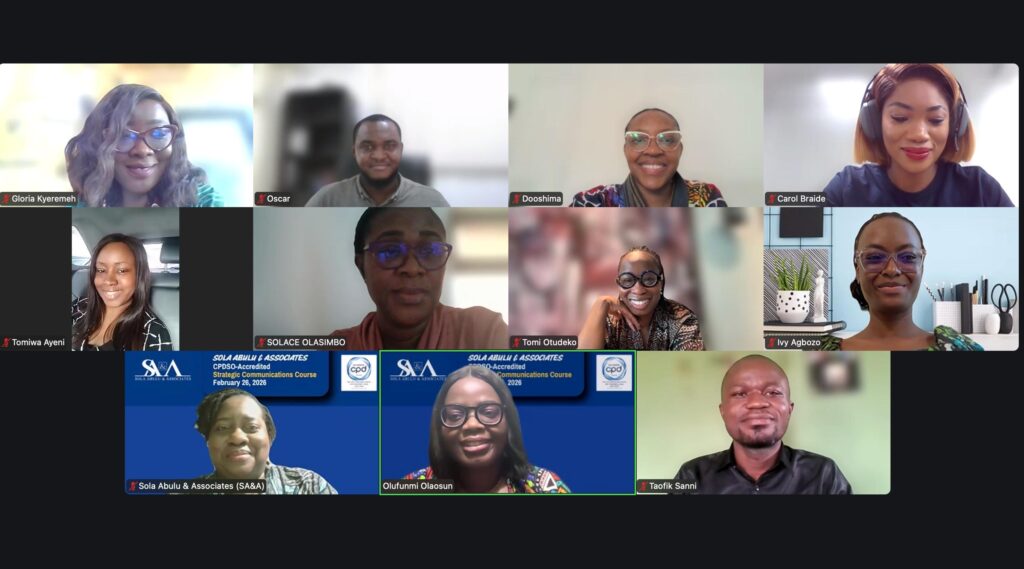 The 9th Cohort of the SA&A Strategic Communications Course held successfully on Thursday, February 26, 2026 online from 9AM – 4PM with 9 participants in session from Nigeria and Ghana. The course consists of 6 modules focused on preparing participants for every aspect of Corporate Communications.